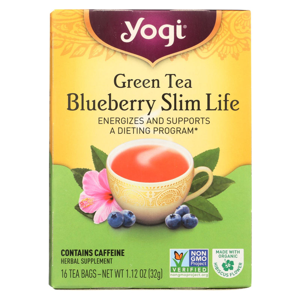 Yogi tea blueberry slim life green tea is an herbal supplement that energizes and supports a dieting program. This box of 16 blueberry slim life green tea bags is organic and contains non-irradiated ingredients and caffeine. Blueberry slim life green tea is made with a proprietary blend of herbs including organic bilberry leaf, organic hibiscus flower and organic green tea leaf.