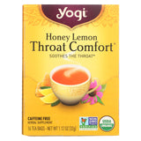 Yogi honey lemon throat comfort tea is packaged in 16 tea bags, each of which will make an 8 fl. Oz. Cup of herbal tea. Steep your tea bag in hot water for 7 minutes. This beverage was formulated to ease throat irritation. The all-organic ingredients include honeybush, peppermint leaf, wild cherry bark, lemon myrtle leaf, licorice root, slippery elm bark and natural honey and lemon flavors. The oxygen-bleached tea bags of this caffeine-free, non-gmo and kosher drink are compostable.