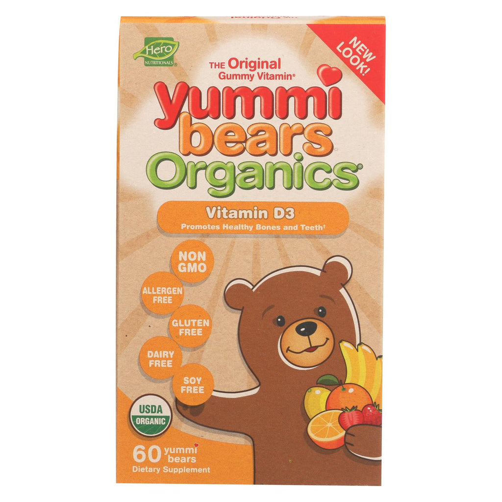 Yummi bears organics vitamin d3 are manufactured in our state-of-the-art certified organic facility. These delicious vitamins are made from all-natural fruit flavor and colors. These fruit gummies also promote a child's healthy immune system and strong bones. As well as tasting great, these yummi bears are also organic, gluten free and non-gmo. Each box of yummi bears organics vitamin d3 contains 60 pieces of product.