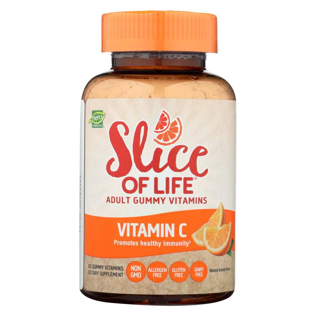 Slice of life vitamin c is a dietary supplement. This product is gluten-free and specifically formulated for adults to promote immune health. Slice of life vitamin c is orange-flavored and does not contain artificial colors, flavors, or preservatives. This product is packaged for your convenience and contains 60 gummies of product.