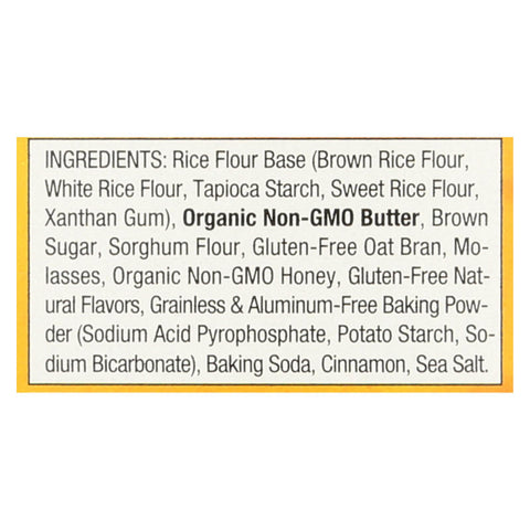 ingredients : rice flour base;brown rice flour;white rice flour;tapioca starch;sweet rice flour;xanthan gum;organic non-gmo butter;brown sugar;sorghum flour;gluten-free oat bran;molasses;organic non-gmo honey;gluten-free natural flavors;grainless & aluminum-free baking powder;sodium acid pyrophosphate;potato starch;sodium bicarbonate;baking soda;cinnamon;sea salt